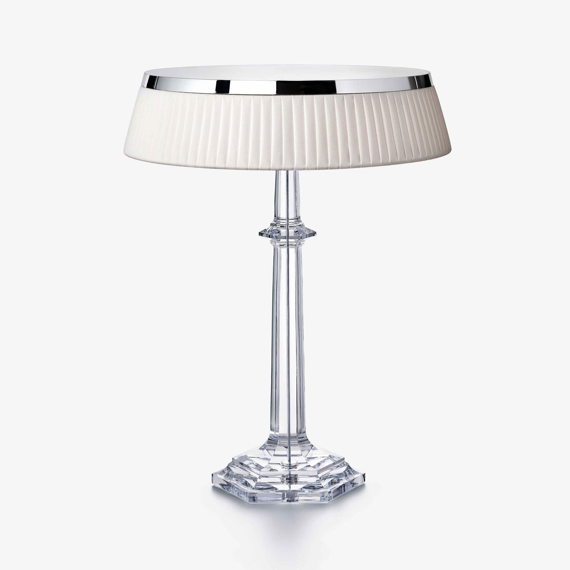 Baccarat and Flos reveal their new collaboration with internationally renowned creator Philippe Starck. BON JOUR VERSAILLES, a collection of lamps born from History and Human Intelligence. The BON JOUR VERSAILLES collection, with two models available in crystal and polymethacrylate (PMMA), solves the paradox between industrial precision and artisanal know-how, between aristocracy and democracy, between science and poetry. The BON JOUR VERSAILLES lamp sits on top of a finely sculpted transparent crystal or polymethacrylate stand whose lines are reminiscent of the Maison Baccarat most iconic pieces. Crowned with a chrome plate, the lamp features a unique and innovative LED Edge Lighting technology developed by Flos. This revolutionary system, coupled with an elegant lampshade in pleated fabric, allows the diffusion of warm and organic light that reveals spaces, thanks to an infinite optical play, and like a reflection of magical transparency, the lamp, bathed in light, seems to come alive from the inside.