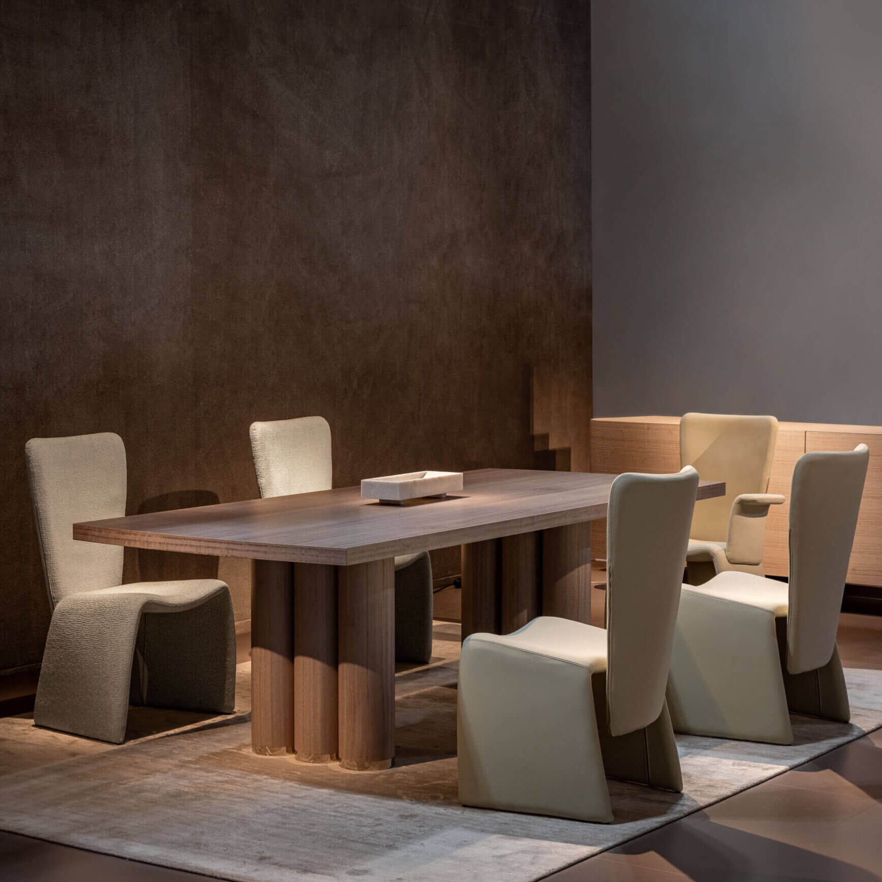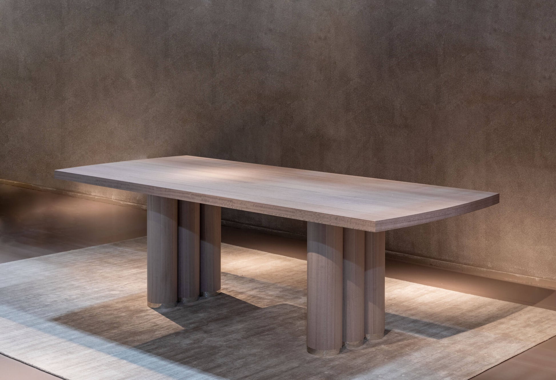 The Brera dining table by Constantini Pietro exudes a bold, geometric aesthetic, perfect as the centerpiece for a contemporary dining room. An imposing tabletop sits on top of an intriguing base consisting of several thick, parallel slabs arranged vertically, creating a robust support system. This unique design feature adds a sense of solidity and heft to the table.