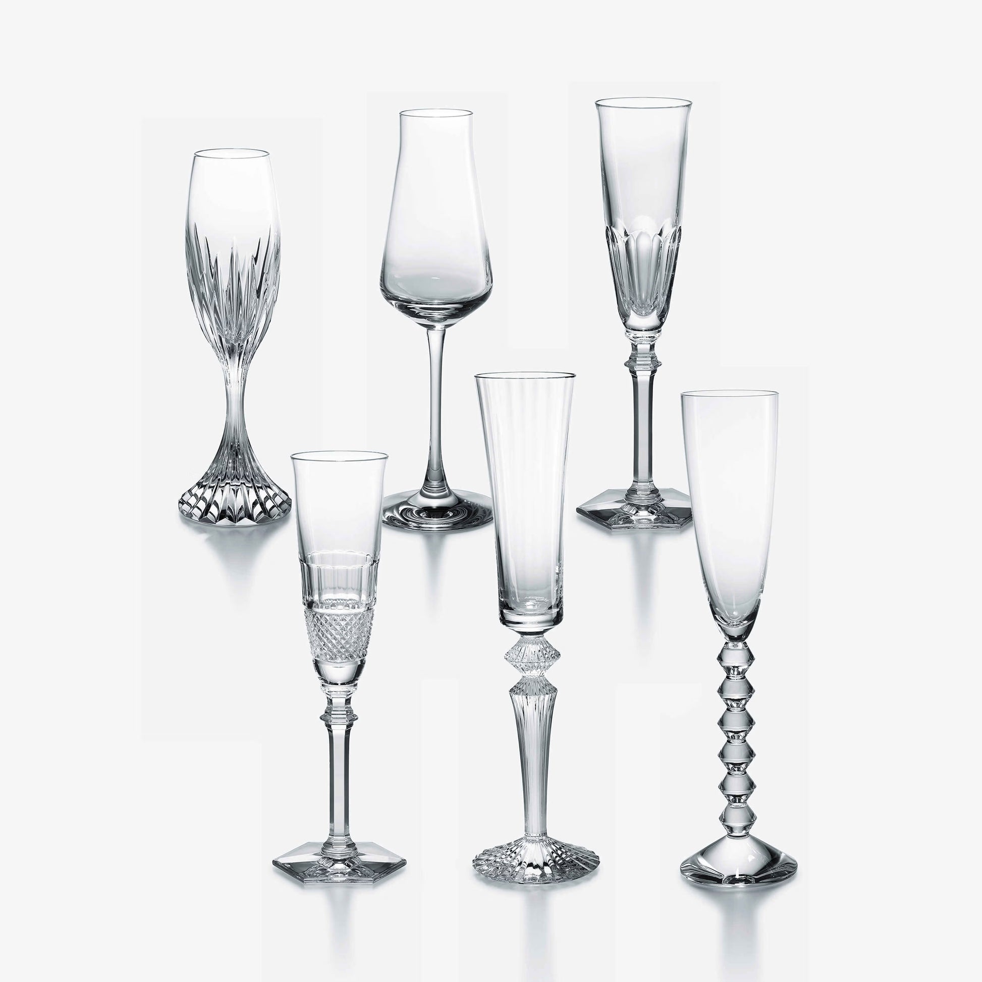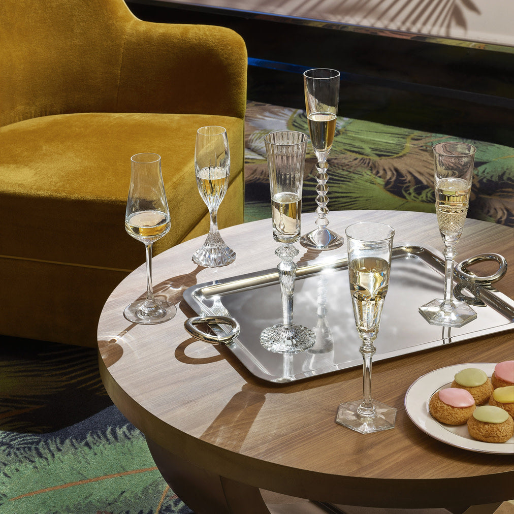 For night-owls and party lovers, Baccarat has dreamed up an exceptional set of six champagne glasses. Champagne, Royal Mojito or Bellini, amaze your guests and give your parties a real buzz all night long. The ideal gift to add a little sparkle to life. This box contains 6 flutes: a Mille Nuits 2810597, Vega 2811802, Harcourt Eve 2802588, Diamant 2807400, Château Baccarat 2611149 and a Massena 2811797.