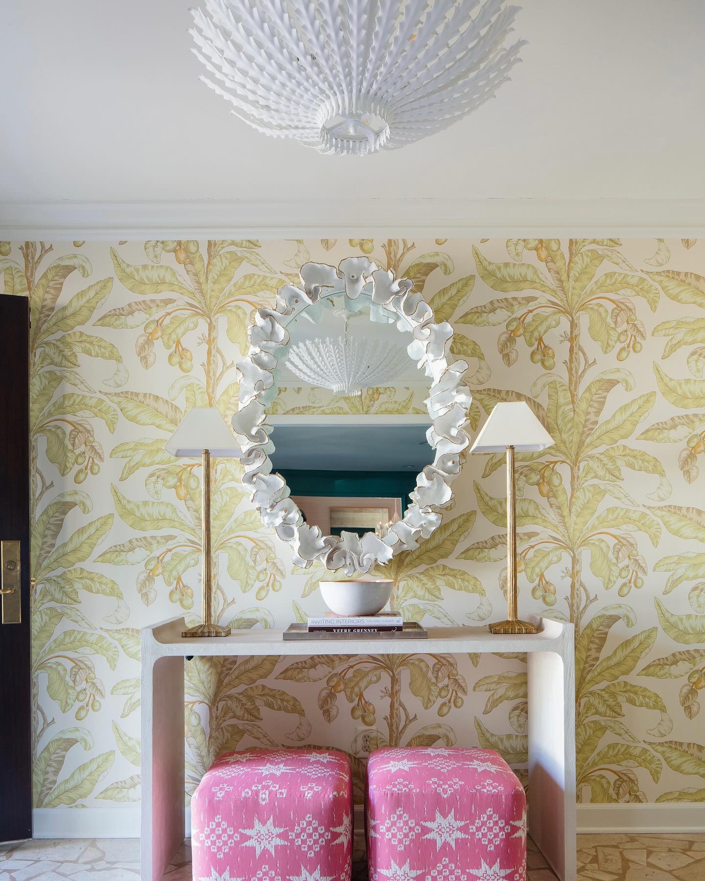 Leaf coral was the inspiration for this remarkable piece. Hours of molding and hand painting are necessary to fashion the Coco's undulating oval of white coral. For a less casual interpretation, a thin silver or gold tip is applied to the end of each ''leaf.'' This mirror has a ruffled frame with an approximate 6” depth.