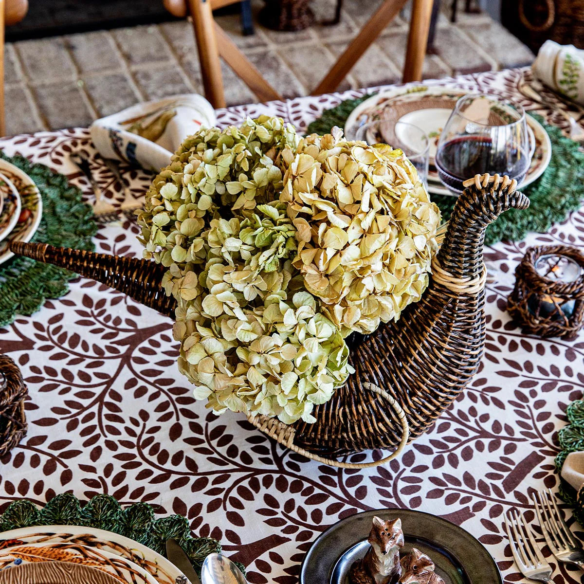 A delightful display of woodland wonder for Fall decorating, our charming pheasant brings natural drama and delight to your entryway, mantelpiece, buffet, or dining table. Hand-made of beautifully woven abaca, wicker and rattan, with a clear glass vase nestled within to house whatever autumnal arrangements you dream up, from brambles and branches, to florals and feathers.
