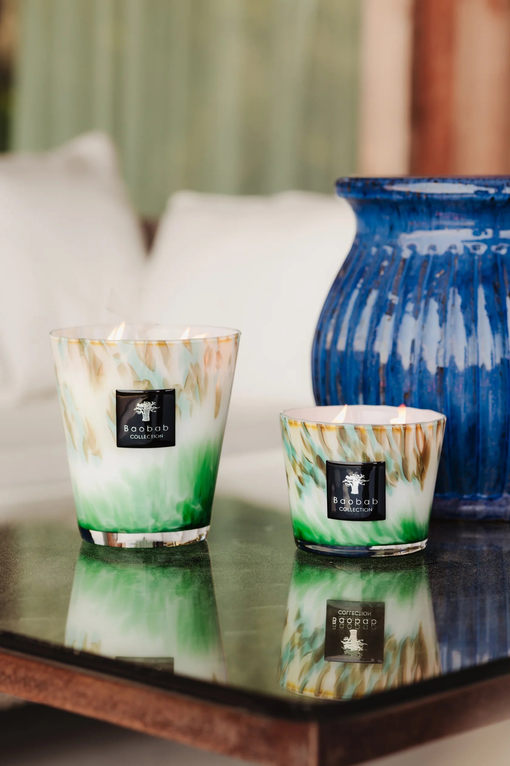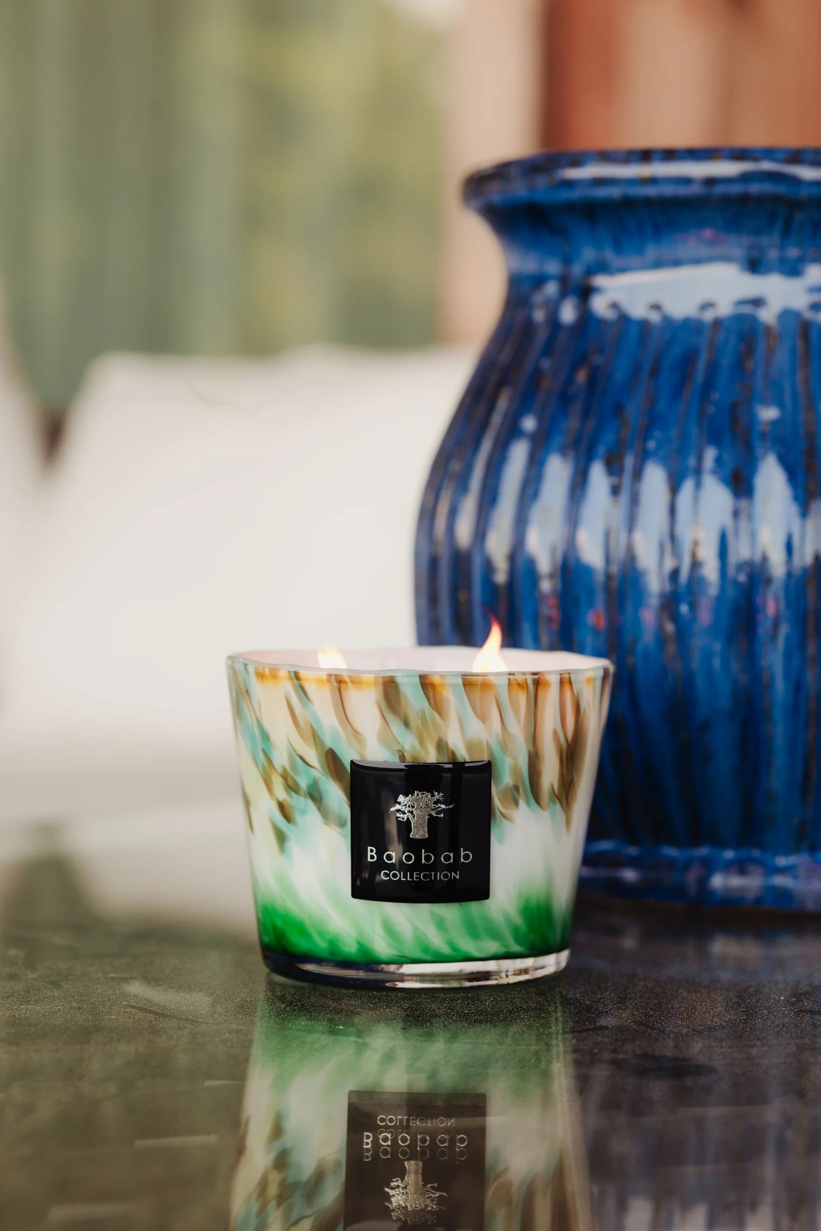 Inspired by the exquisite greenery of Madagascar, the Eden Forest candle incorporates varying shades of green. The opalescent glass contains large inlays that recall leafy plants, a challenge that demands the kind of dexterity that our artisans have.