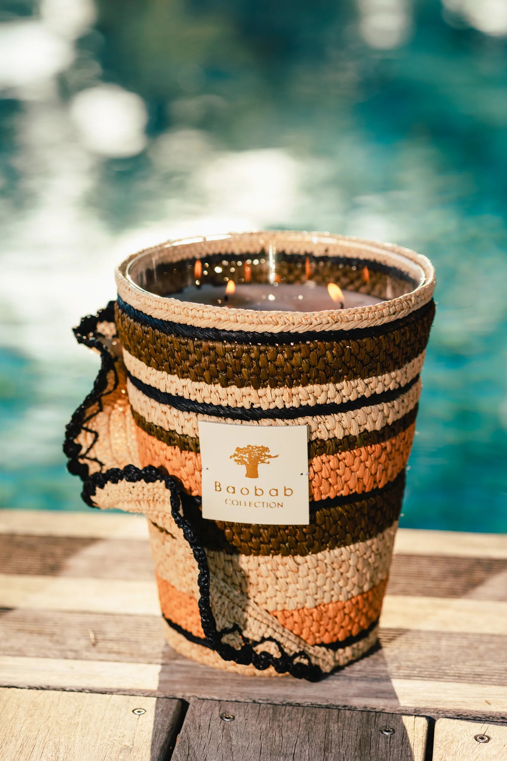 The subtle colours of nude pink and khaki are set in bayadère stripes on the raffia of the Anjara scented candle. Hand-crocheted by the women of Madagascar, this candle becomes a festive and delicate decorative object. A black embroidered side ruffle gives the scented object the look of a fashion accessory.