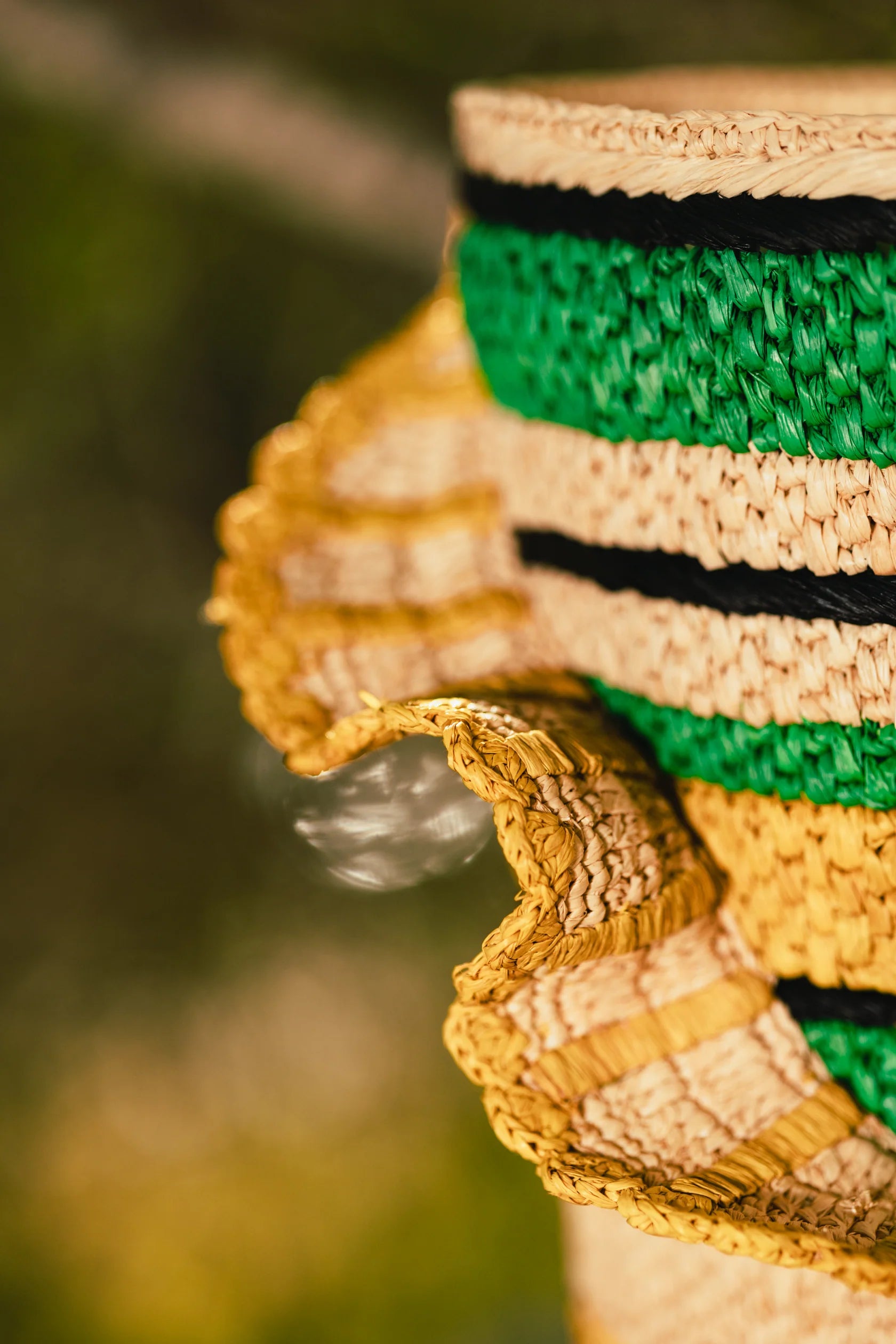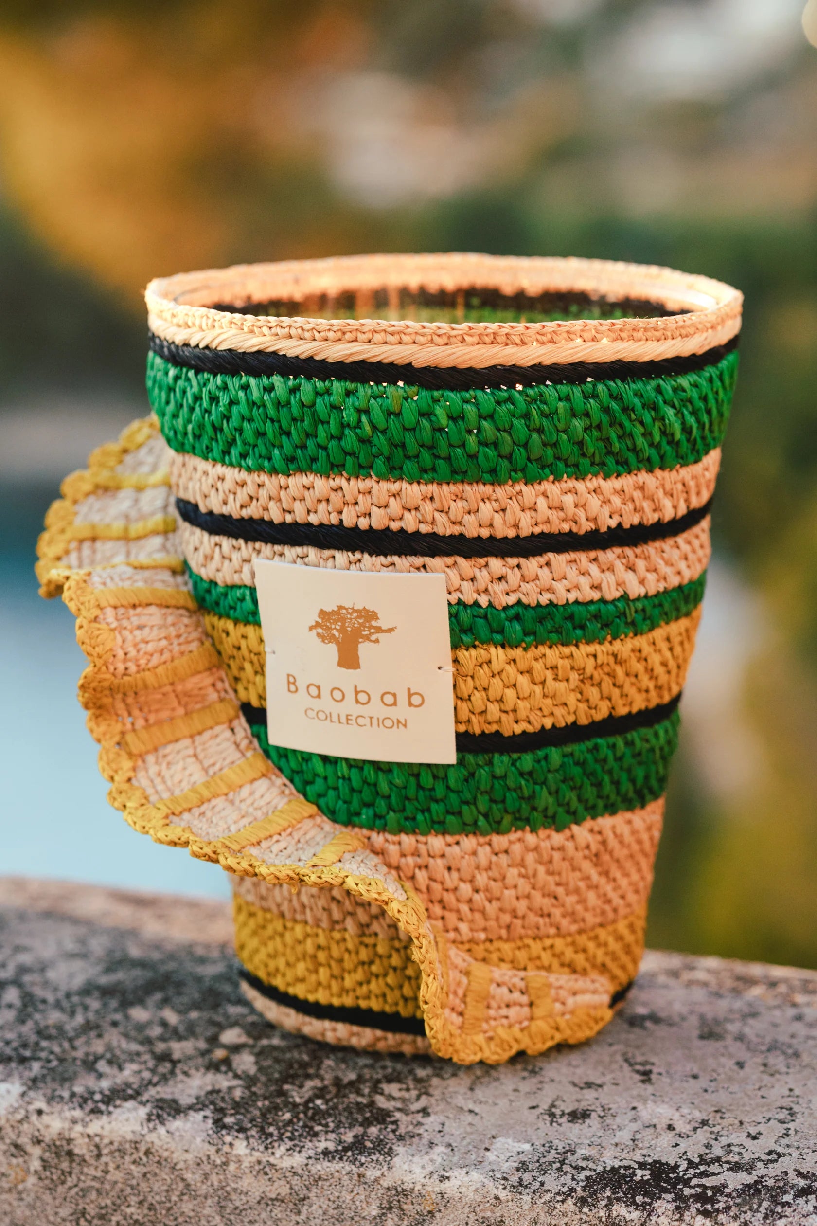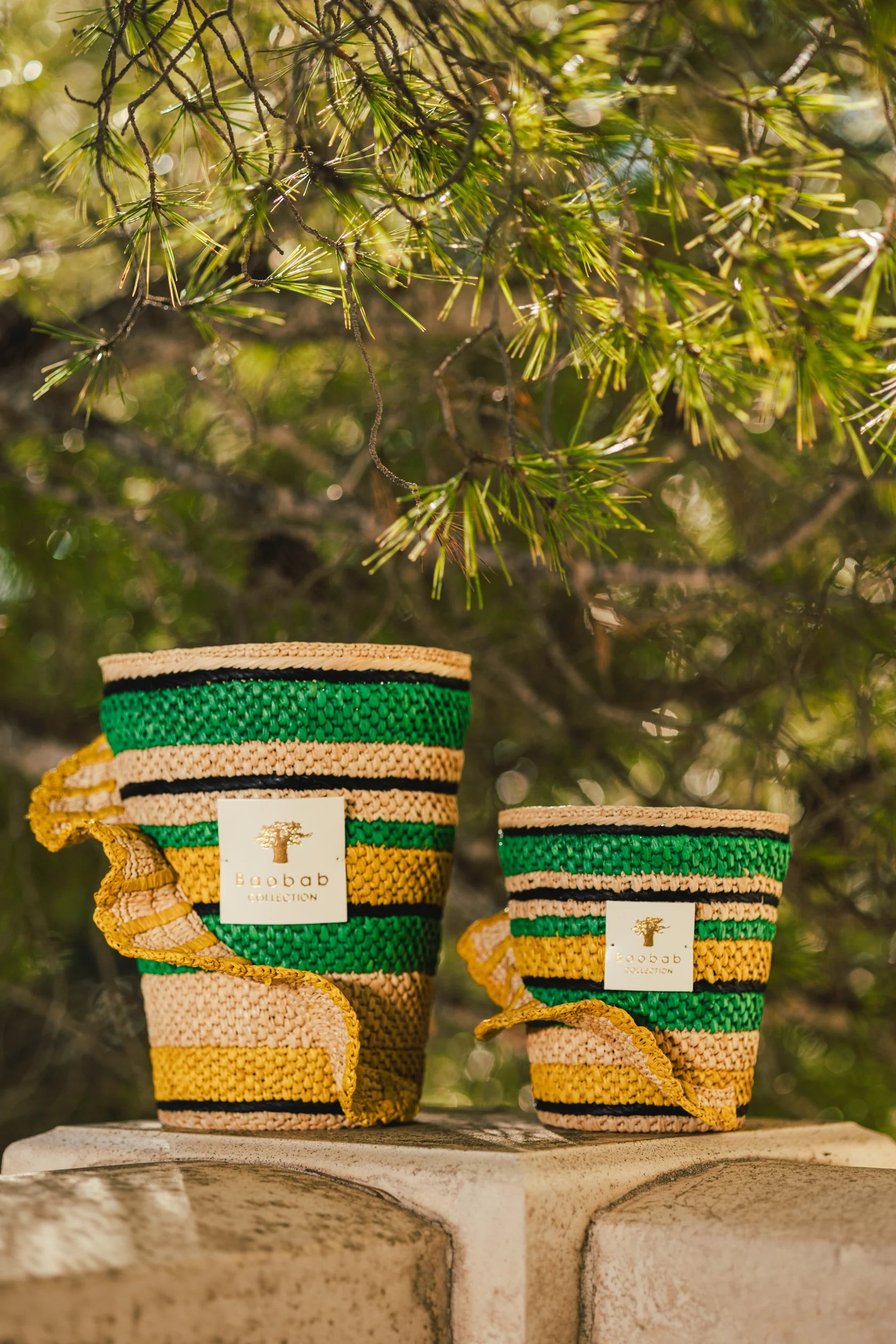 The Milalao scented candle is wrapped in hand-crocheted raffia from our women’s cooperative in Madagascar. The bayadère striped pattern, a mix of lemon yellow and acid green on a natural background, is reminiscent of the deckchairs on the beaches of the Côte d’Azur. A yellow embroidered ruffle across the top makes this scented candle a genuine decorative object inspired by the world of fashion.