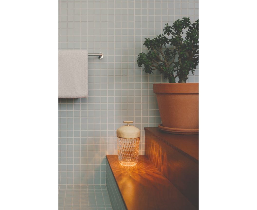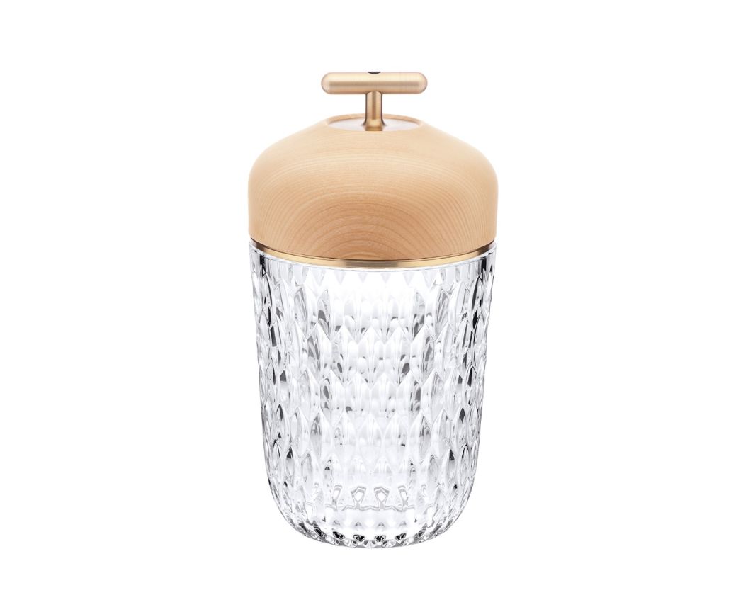 Above all, it is a condensation of technology at the service of crystal: an autonomous, nomadic and cordless LED lamp. It has two light temperatures, a light warm white and an extra warm white. Four intensity levels are available for each light level. It can be recharged for up to 40 hours when used at low intensity.