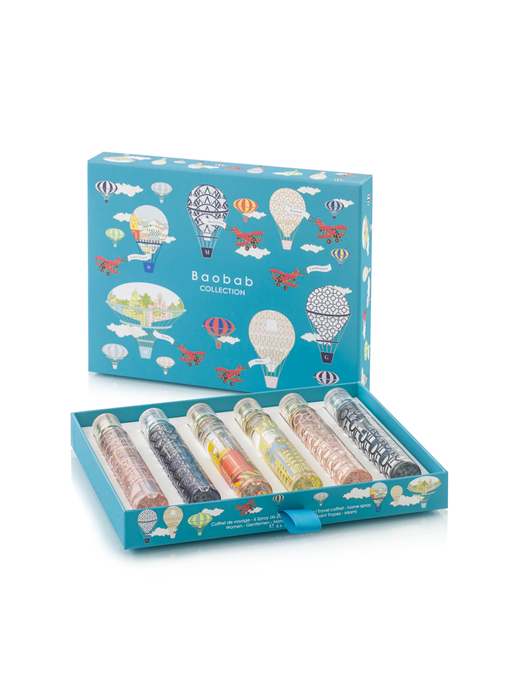 Decorated with precious gold or platinum silkscreen prints, the My First Baobab home sprays change decor to be placed in a discovery box containing all six sprays for an unforgettable sensory experience. A journey not to be missed!