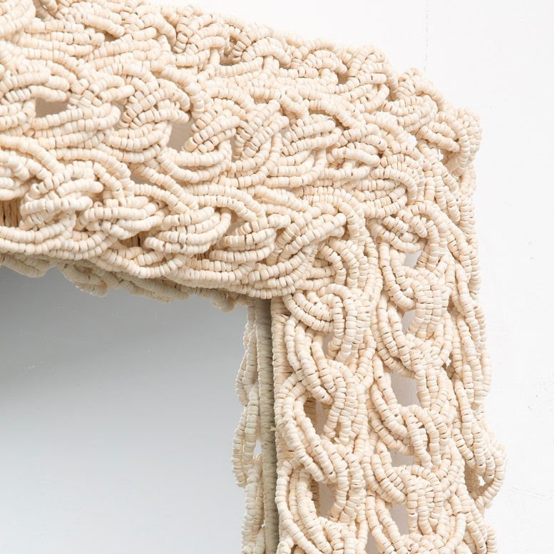 Thousands of coco beads are hand threaded and then woven into macrame-like chains to create the domed border of our Inga. The outsized frame and simple shape give the mirror's stunning craftsmanship center stage.