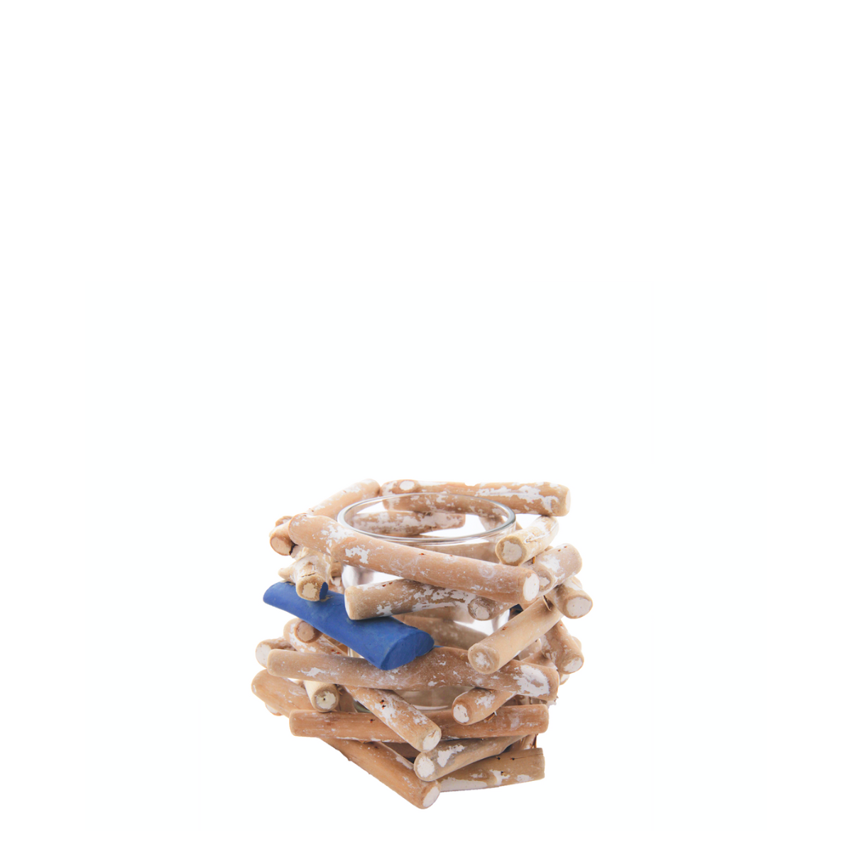 This decorative tealight holder features a natural, white, and blue dried wood mosaic design with a cylindrical glass interior that protects and stabilizes a candle. Designed to hold a cylindrical candle, it enhances any space with a clean, natural aesthetic. Measuring 15 cm in height and 17 cm in diameter, it is composed of 90% dried wood and 10% glass. For safe use, place on a stable surface and never leave lit candles unattended.