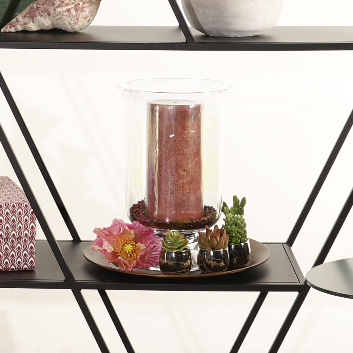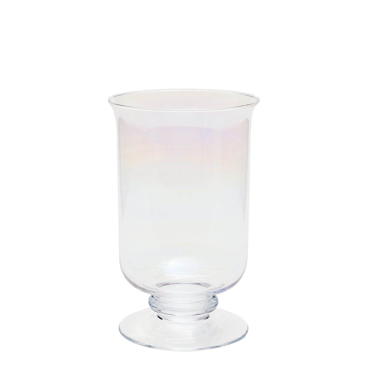 This transparent glass footed votive holder doubles as an elegant vase, seamlessly enhancing any sophisticated decor. Its clear glass features subtle iridescent multicolored reflections, adding a refined touch. Measuring 30 cm in height and 19 cm in diameter, it combines aesthetic appeal with versatile functionality. Crafted from quality glass, it is ideal for stylish candle displays or floral arrangements.