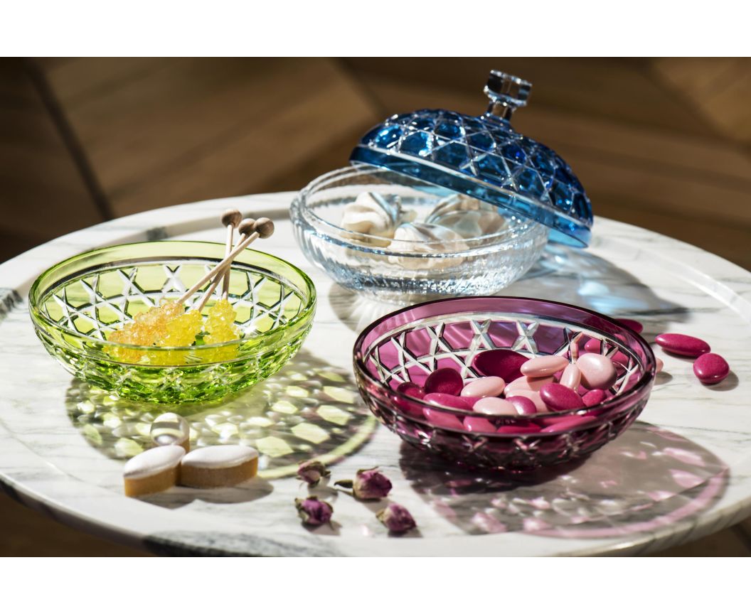 Saint-Louis' bestseller and iconic collection of timeless lighting fixtures, it is now being deployed as a matter of course in new universes. New objects emerge from it: lamps, boxes, vases... further expanding the range of possibilities. For example, chandelier wicks are transformed into acid-colored dishes and boxes. This collection is characterized by a distinctive pierrerie cut (also known as large diamonds).