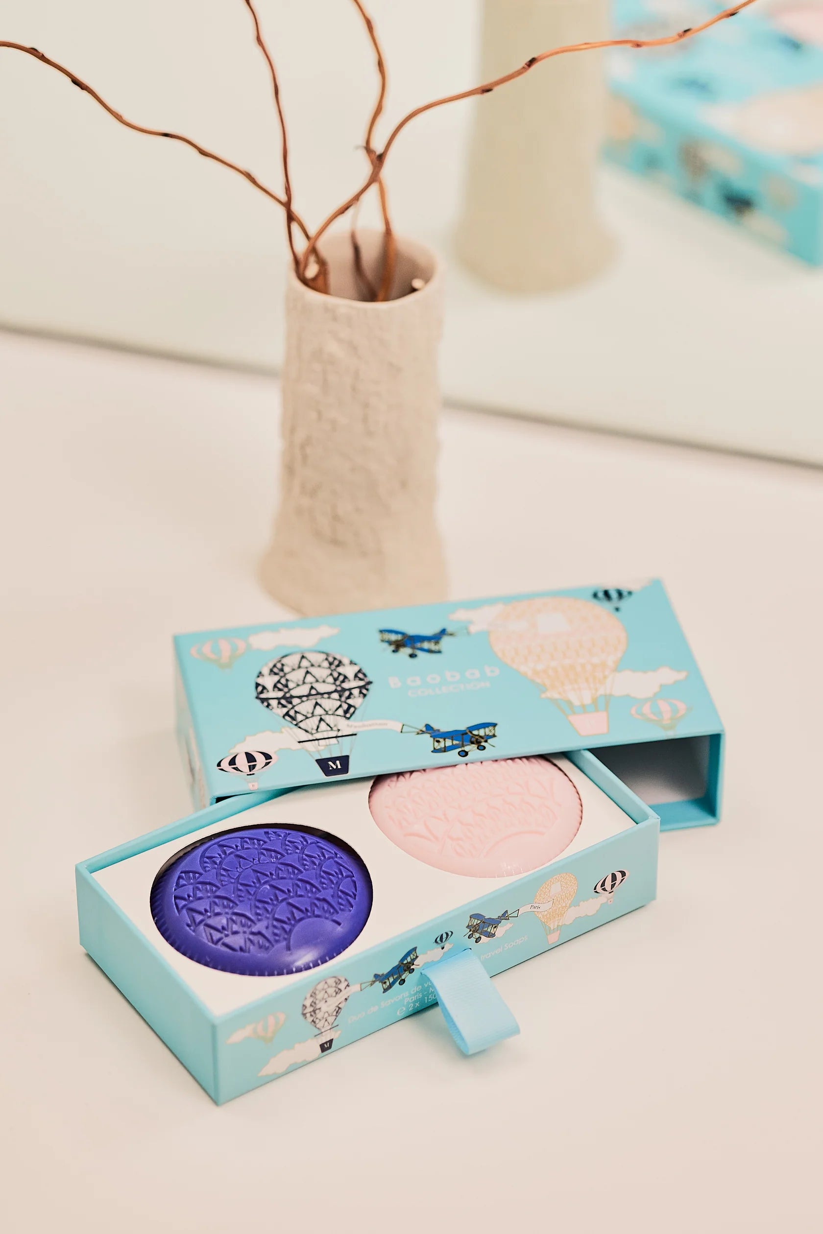 Embark on a romantic getaway to the capital of love and a city trip to the city that never sleeps! Our soap duo, Manhattan and Paris, is elegantly presented in a charming turquoise-blue box adorned with hot air balloons. Embossed with iconic motifs from these iconic cities, our soaps leave a gentle sensation on your skin, thanks to their composition enriched with baobab oil.