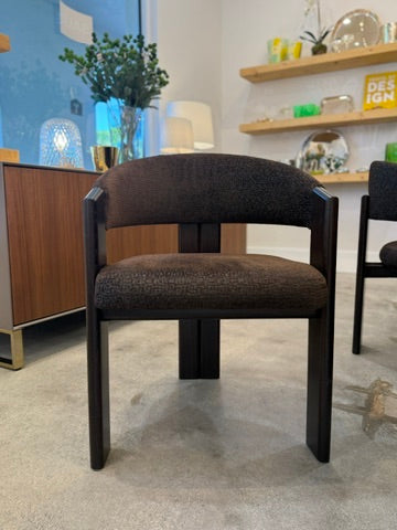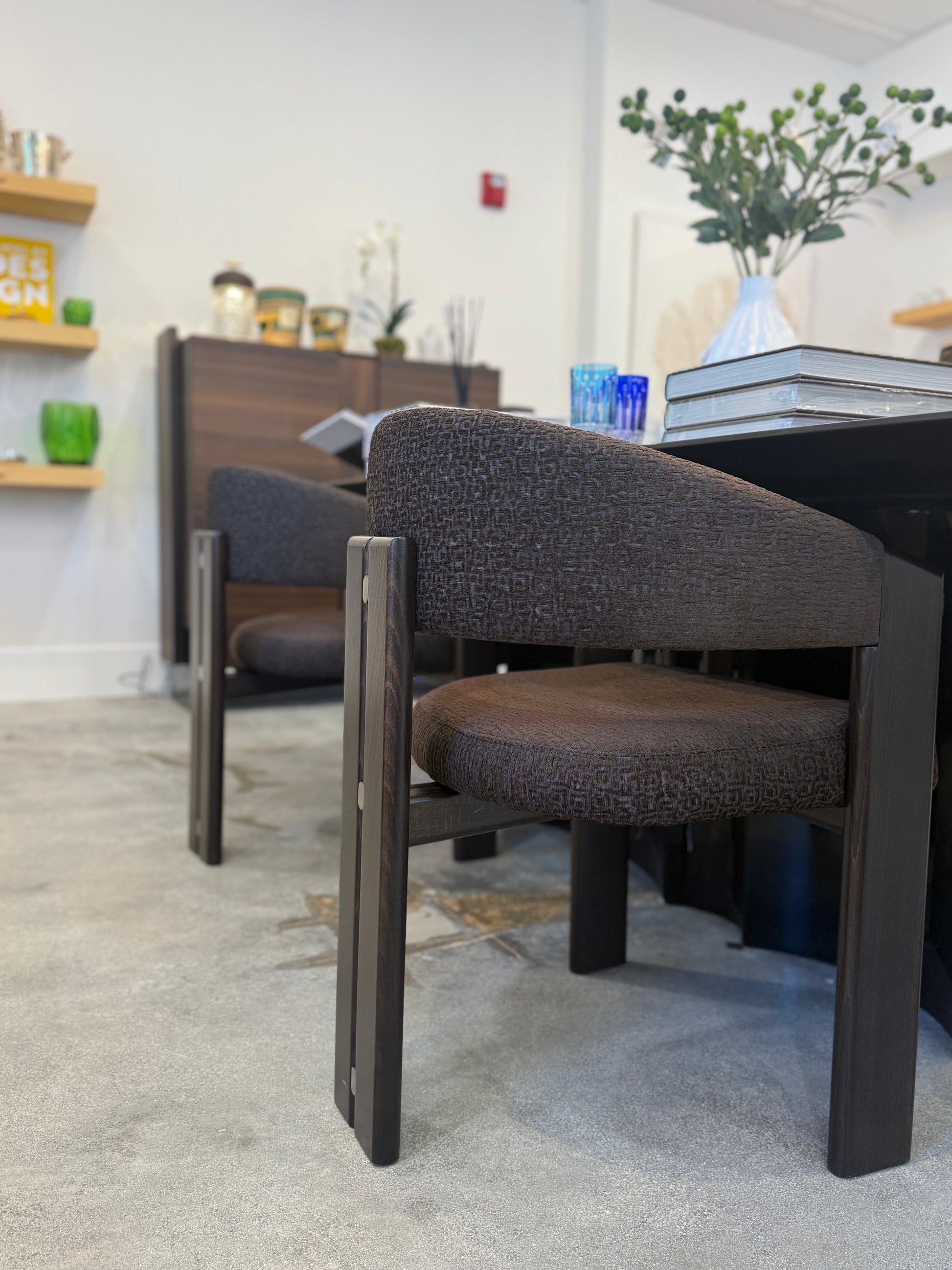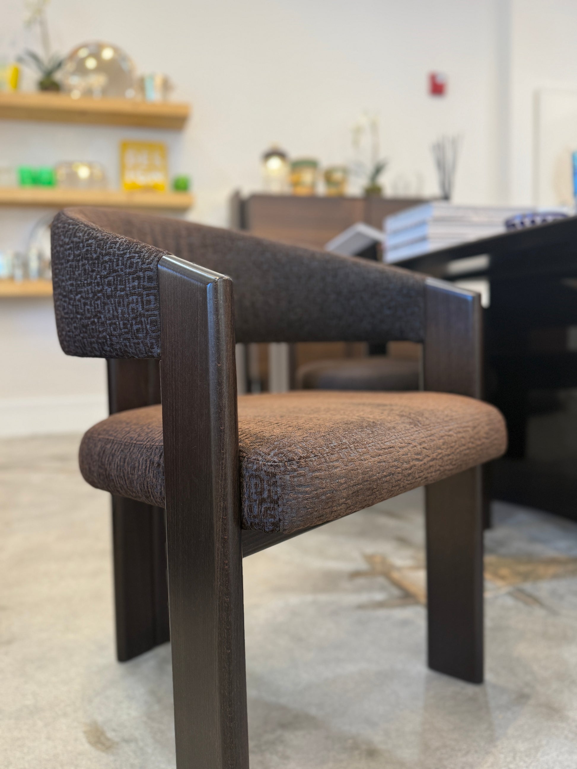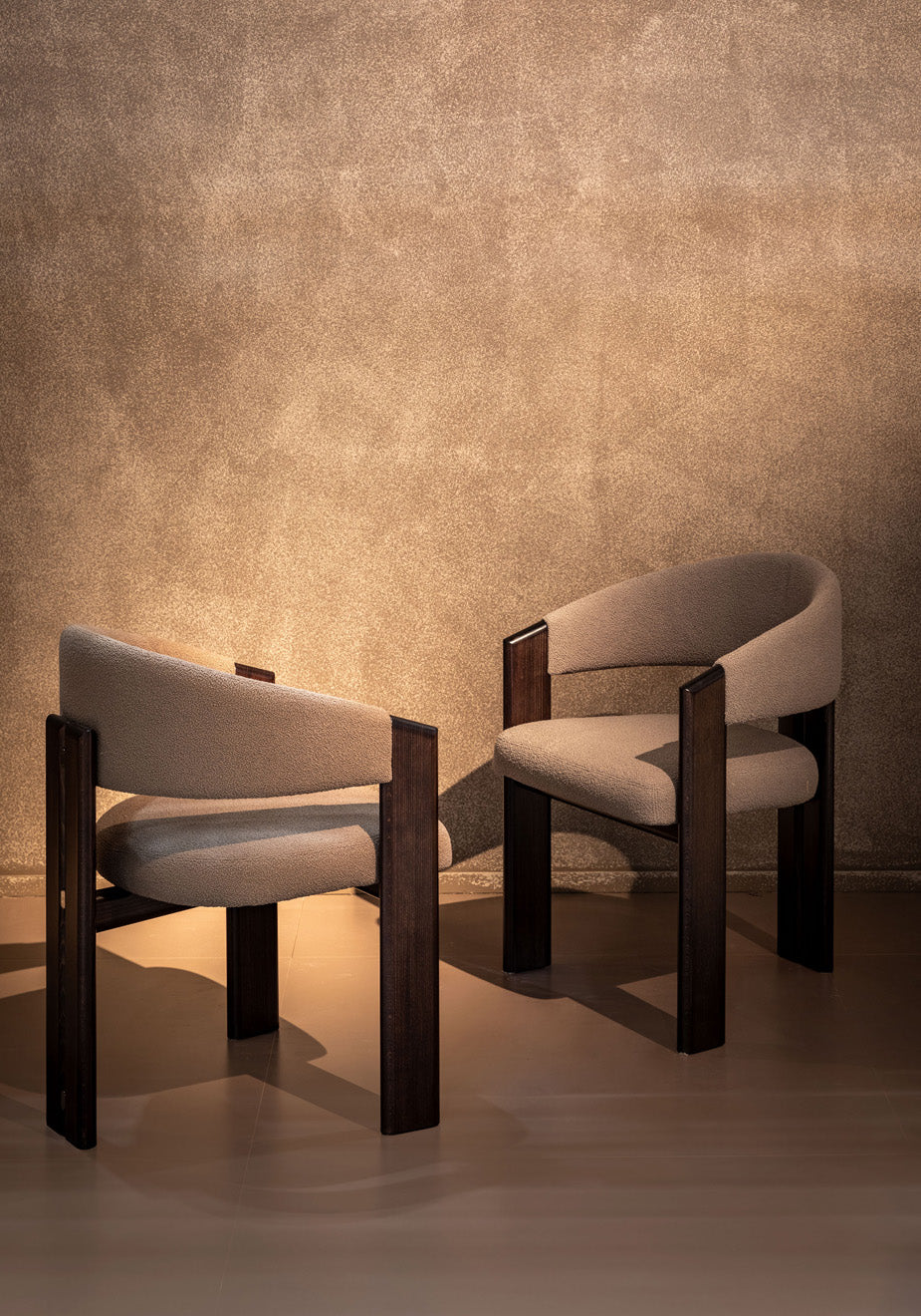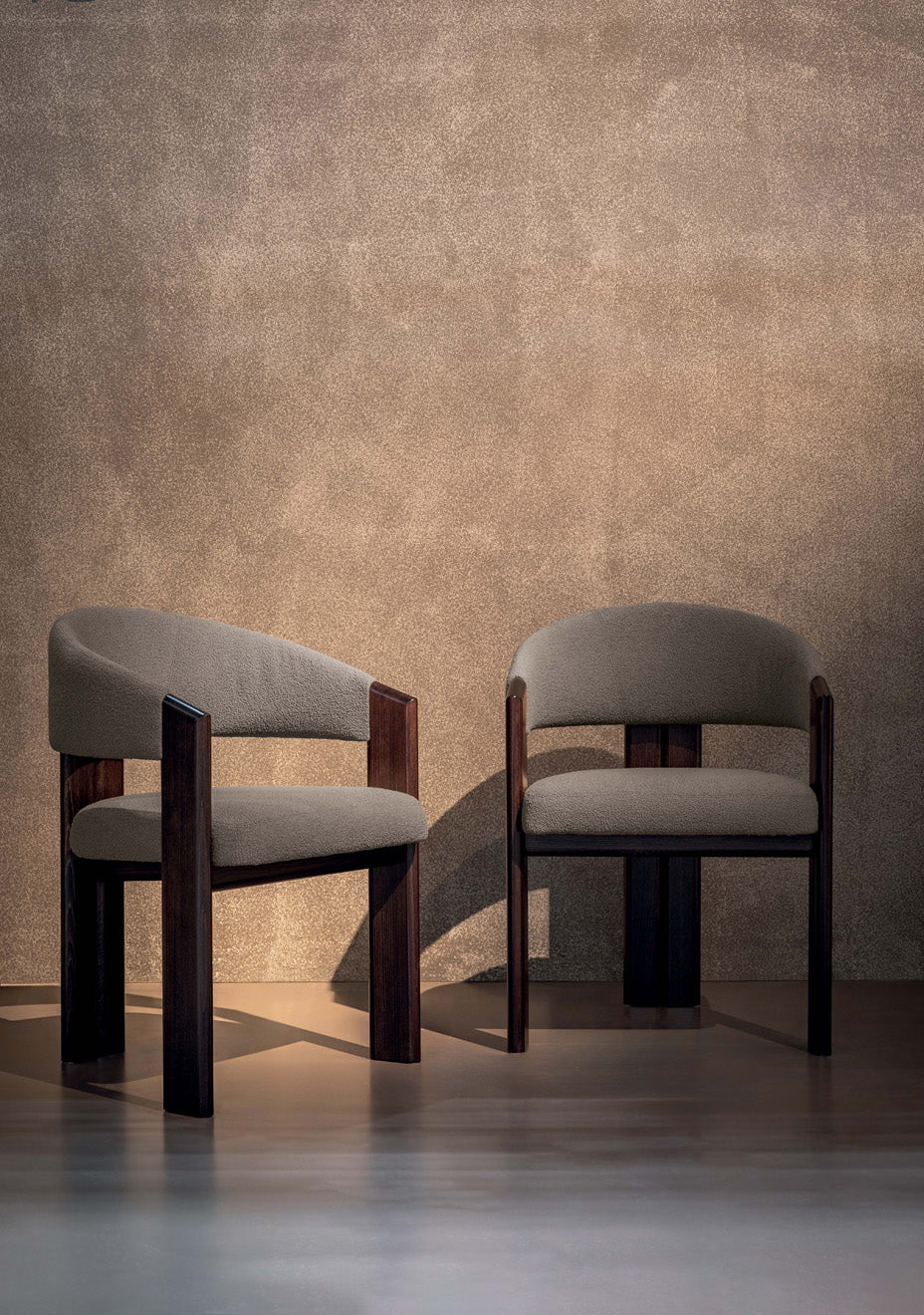 The supporting structure consists of two solid and linear front legs to which a third element is added at the back, thus fastening the seat and backrest together. Oval-shaped metal elements represent a precious detail that completes the composition with a unique and elegant touch. The solidity of the Tweet’s structure blends seamlessly with the plush padding, providing comfort on the broad seat and resting against the semi-circular backrest. Tweet is available in various wood types and finishes, in a wide range of fabrics and leathers, with the possibility of customizations.