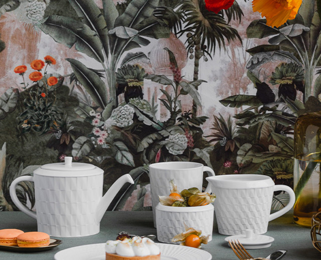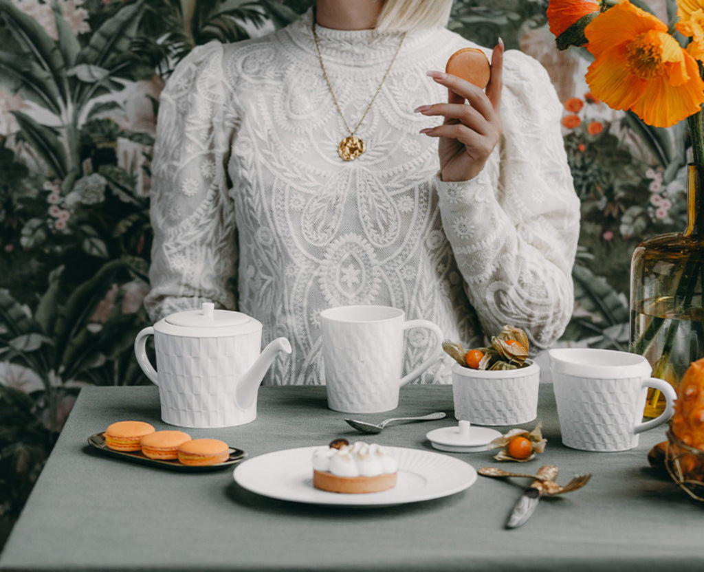 The delicate design of this new collection combines various influences: the light effects of the rice paper Japanese screens, the art of origami folding, the braiding and caning of the furniture of the 50s, not to mention the 3D graphics offered by the new technologies. The result is an unprecedent subtle effect of a rigorously geometric pattern taken in twisted momentum. Engraved on the rim of the plates and on the outside of the various pieces of the collection, it is the light that reveals the alternation of matt and shining rendering giving a vibrant radiance that enlivens the whiteness of porcelain.